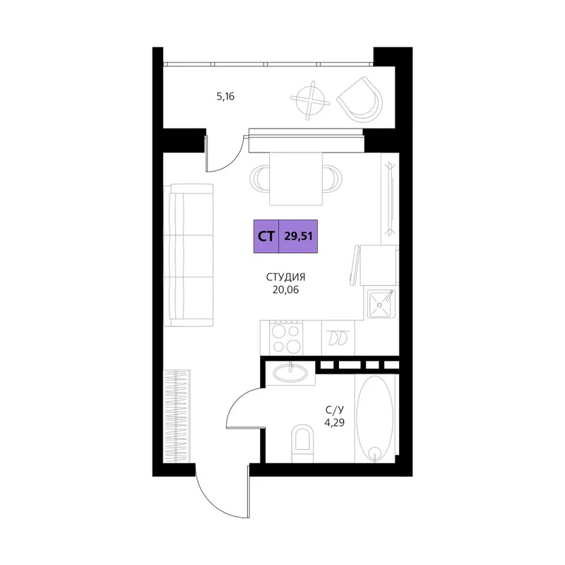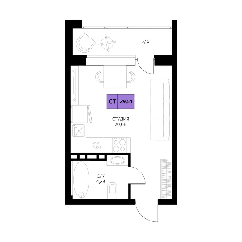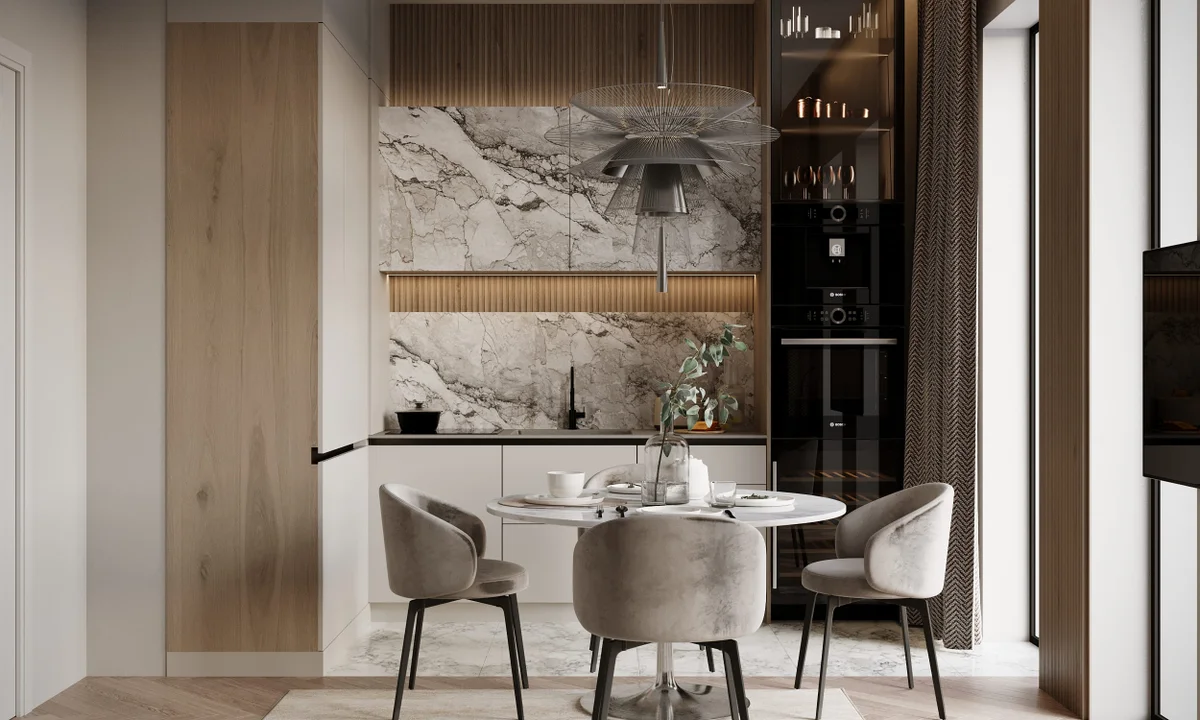 Просторная студия с объединённой кухней и гостиной, в современном минималистичном дизайне. Подойдёт для активных людей, ценящих комфорт и уют в компактном формате.