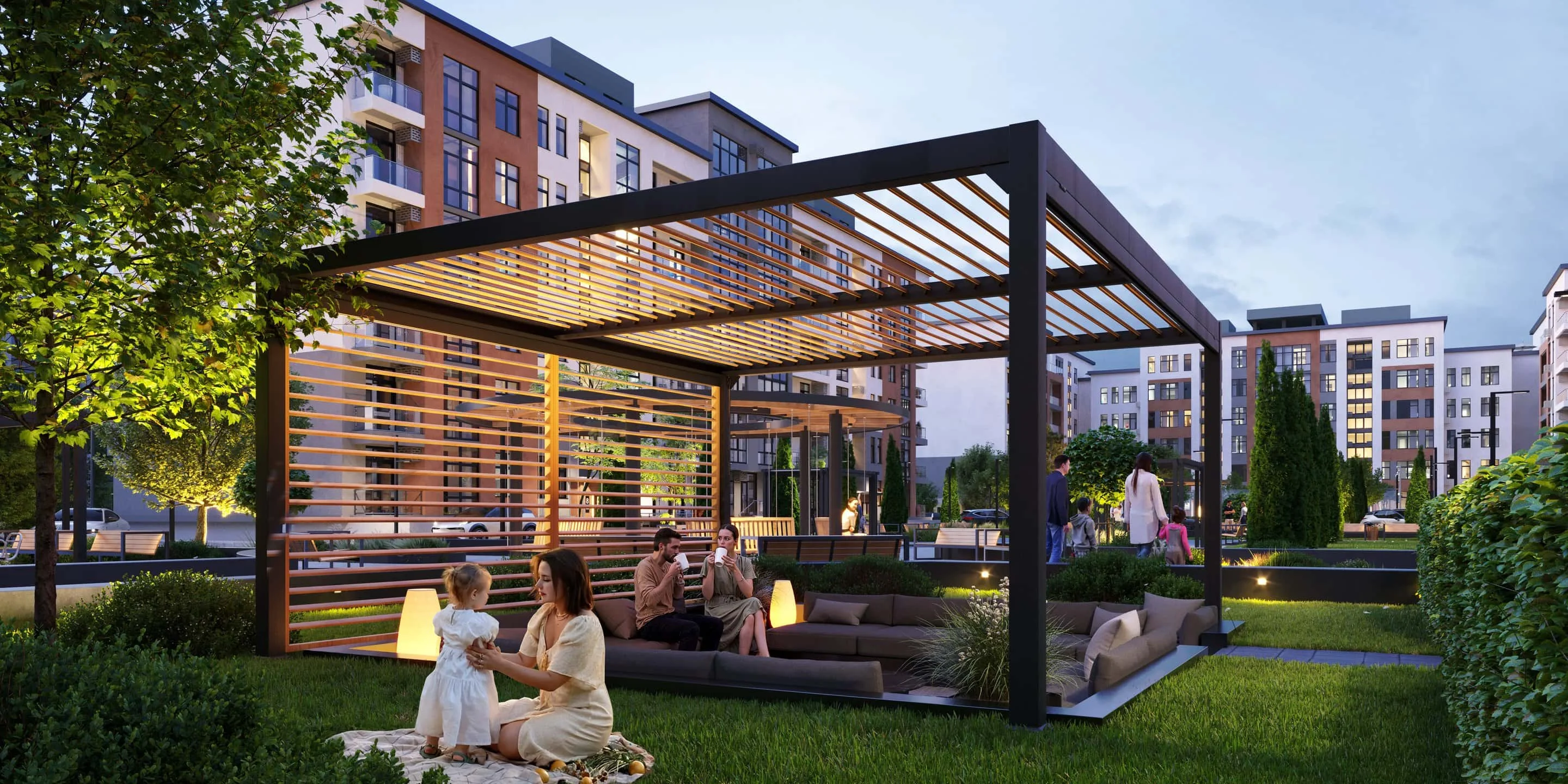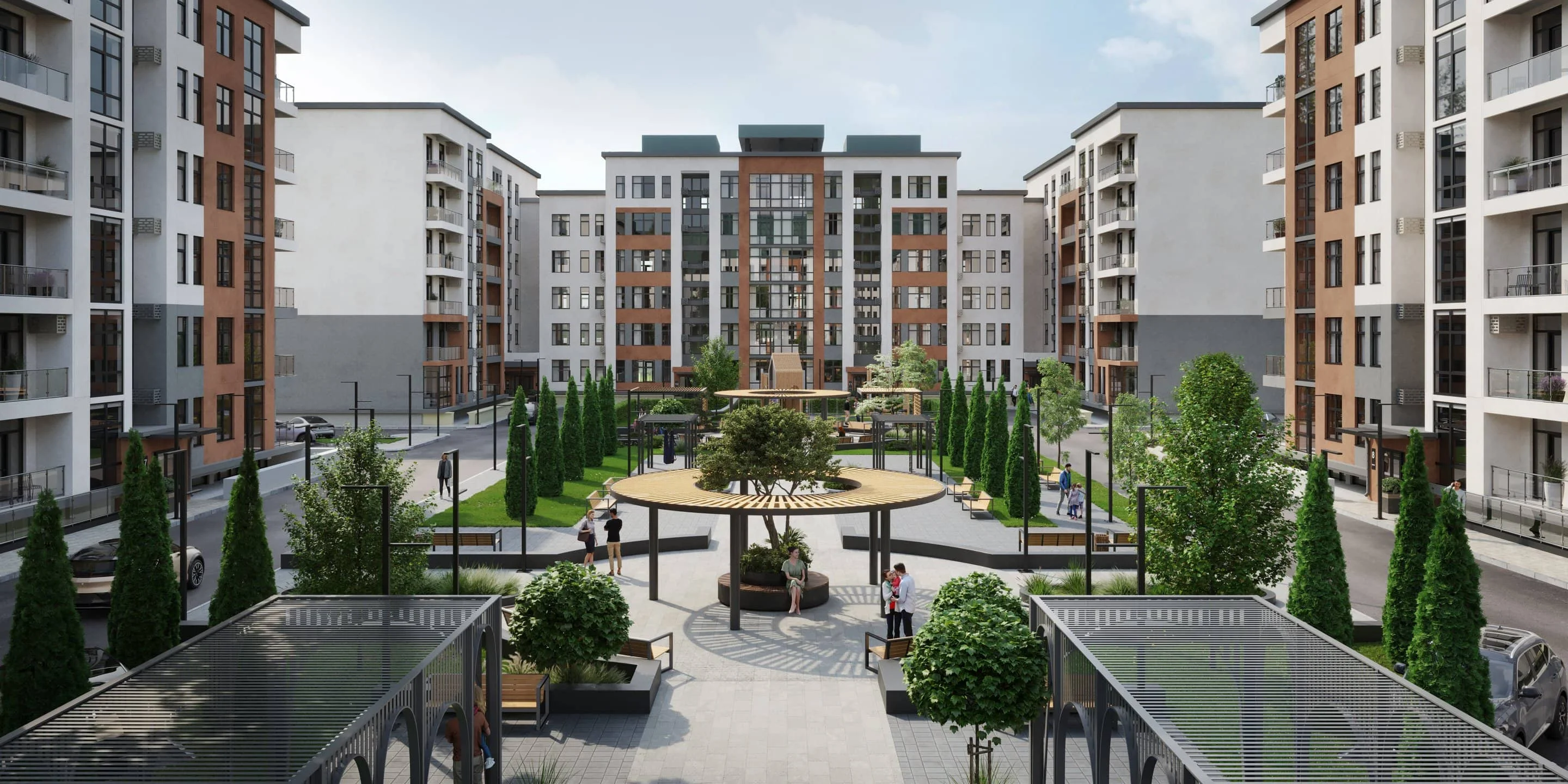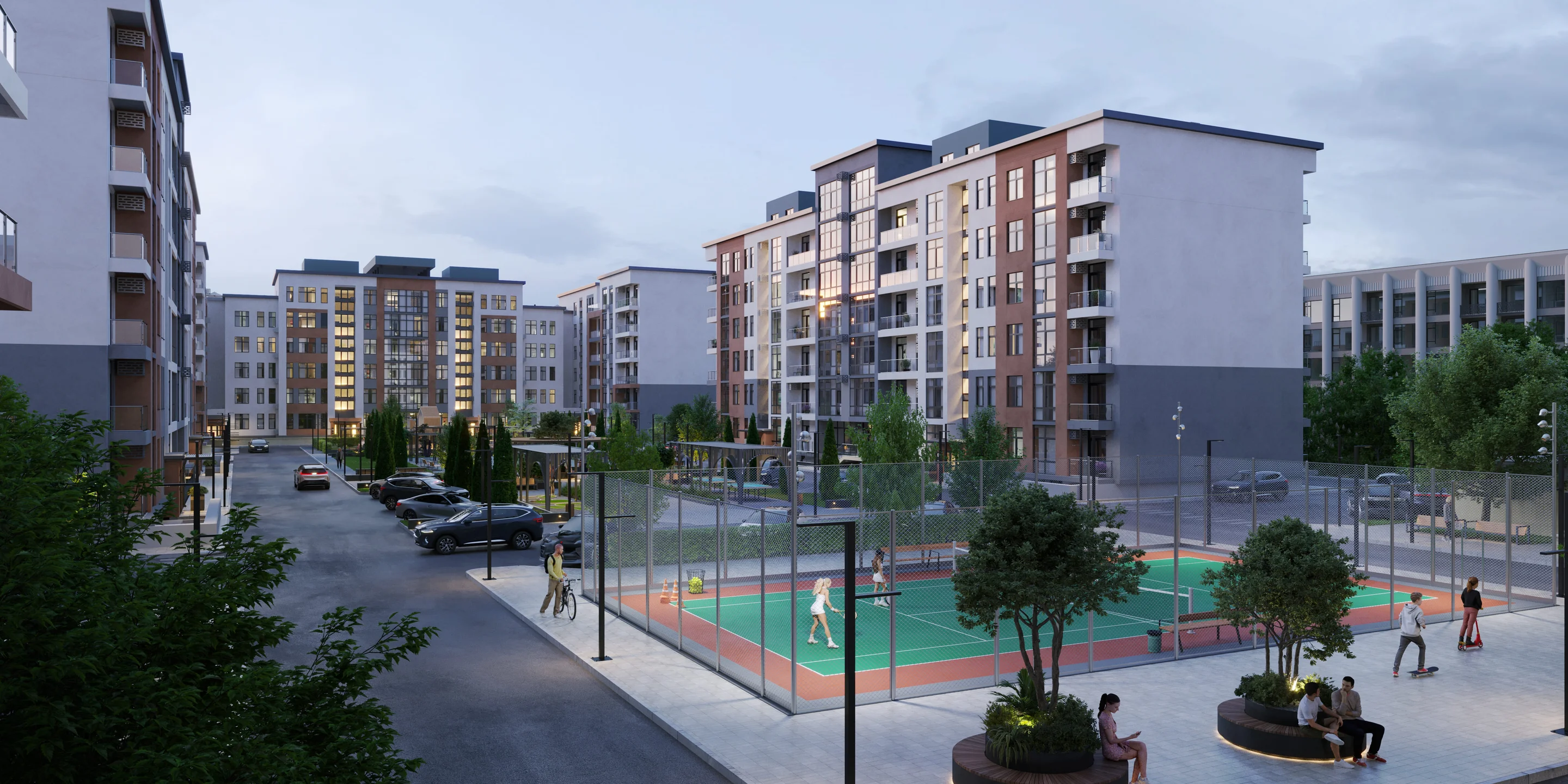 Здесь каждый метр продуман: уютные беседки для встреч, зеленые аллеи для прогулок, спортивные зоны для движения. Современное освещение и комфортное зонирование создают атмосферу, где спорт, семья и отдых становятся единым целым. Это не просто двор — это пространство, где каждый найдет что-то для себя