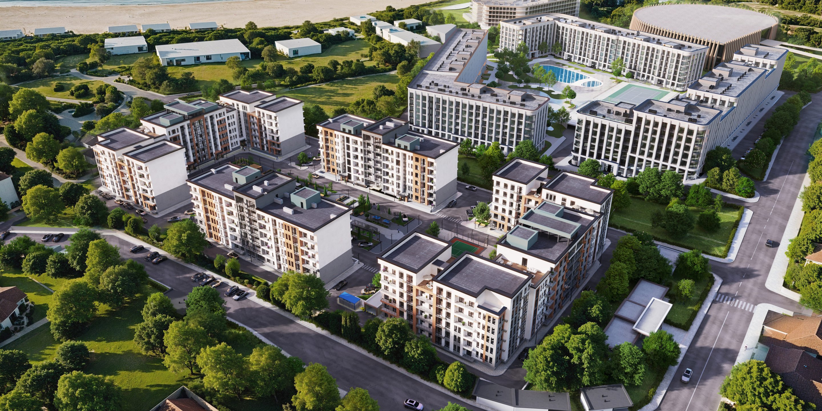 Современный комплекс в 300 метрах от берега моря, объединяющий восемь корпусов в едином архитектурном ансамбле. Создан для тех, кто ценит комфорт, спокойствие, близость к природе и гармоничную среду для жизни и отдыха.